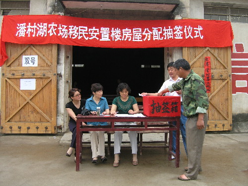 5月23日上午,潘村湖农场种子公司大院内,居住在圩区的居民正秩序井然地参加移民迁建房屋分配抽签活动。