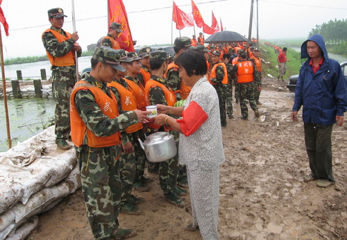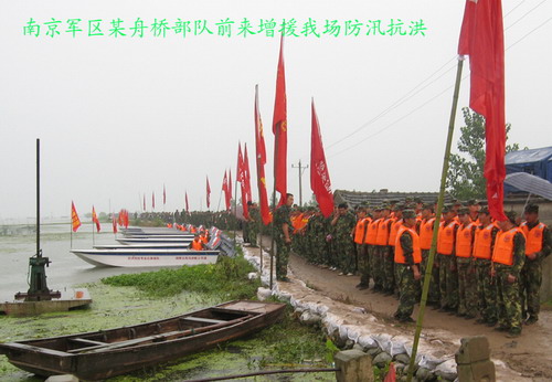 10时许,1200余名武警官兵和地方武装部队聚集焦岗湖农场(中心桥处)中心沟两岸,面对顽固的焦岗湖洪魔,向前来视察慰问的中国人民解放军总政治部副主任刘振起中将宣誓:
