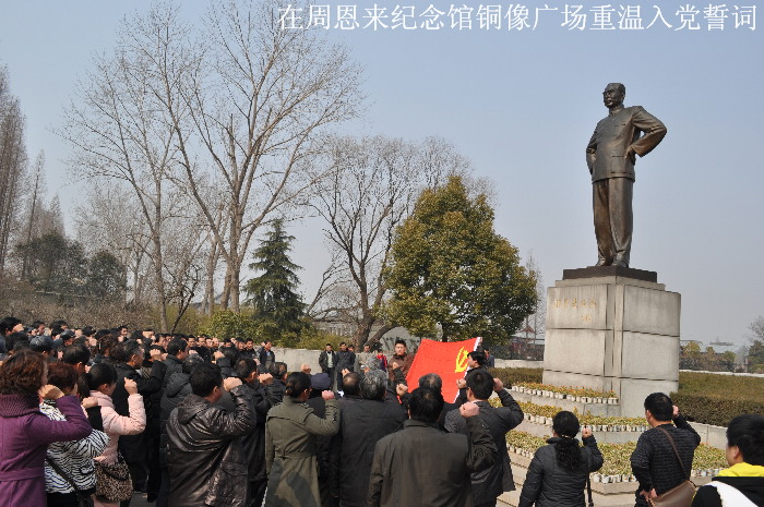 潘村湖农场全体党员代表怀着无比崇敬的心情来到淮安市周恩来纪念馆和故居开展革命传统教育。在周恩来纪念馆广场,全体党员代表面对鲜红的党旗和伟岸的周恩来铜像举起右拳重温入党誓词。在周恩来故居学习了伟人的生平事迹。