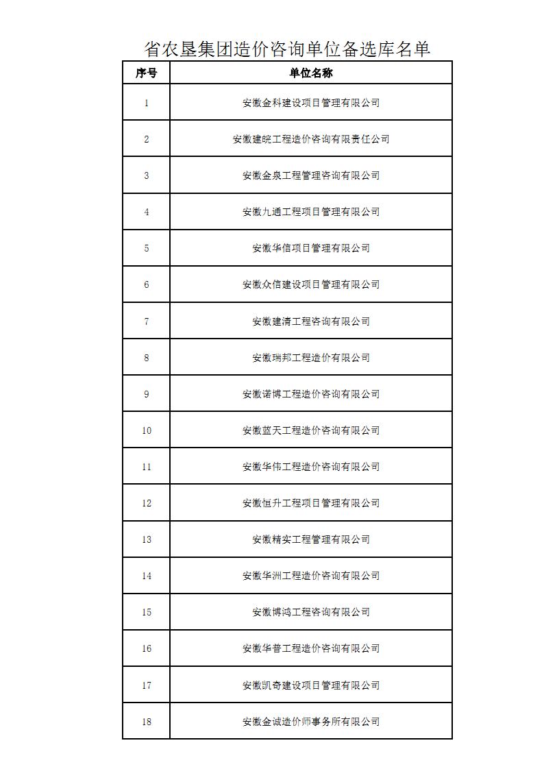为促进省农垦集团进一步提升工程建设成本控制、有效避免资金风险,提高工程造价咨询服务质量和水平,省农垦集团建立造价咨询单位备选库(以下简称“备选库”)。经过公开发布公告、报名、资格审查、评选等程序,35家造价咨询单位进入备选库名单,现予以公布。省农垦集团可根据造价咨询单位的执业情况、提供造价咨询服务质量情况对备选库进行动态调整。