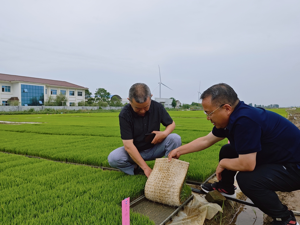华阳河农场水稻育秧现场,农科所技术人员正在查看秧苗扎根生长情况。包丹凤 摄