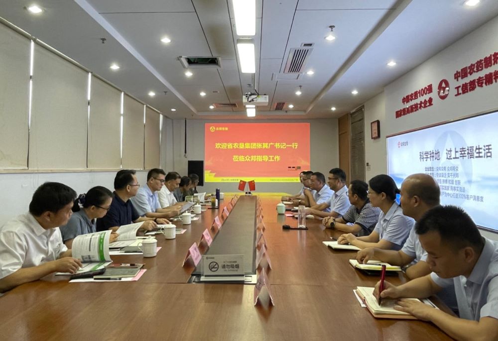 9月5日,农垦集团党委书记、总经理张其广率队赴安徽众邦生物工程有限公司调研农药研发和生产情况并洽谈合作,集团总农艺师姚礼发陪同。安徽众邦生物董事长黄自云、总经理吴电亮参加座谈交流。