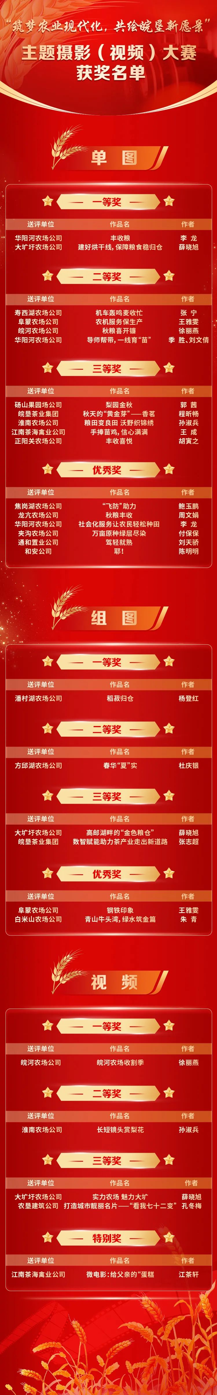 为体现农垦集团“强科技、大基地、全产业链”发展战略取得的新成效,深入实施农垦“两大行动”的新做法,全景展现安徽农垦丰收景象,展示农业现代化美好图景,2024年9月,集团党委宣传部发起“筑梦农业现代化 共绘皖垦新愿景”主题摄影(短视频)作品征集活动,其间共收到作品95幅,其中图片类85幅(含组图),视频类10条。经过部门初选、网络投票、专家评审等环节,2025年春节前夕,大赛评选出单图类、组图类、视频类一二三等奖和优秀奖(特别奖)。现将获奖名单予以发布。