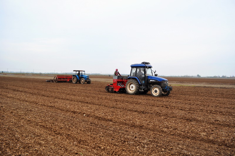 家庭农场职工在小麦原良种繁育基地——安徽农垦潘村湖农场机播小麦。截至10月17日,该农场已播种冬小麦2.9万亩,占计划总面积的91%。(安徽日报2013年10月18日A2版,杨登宏摄)