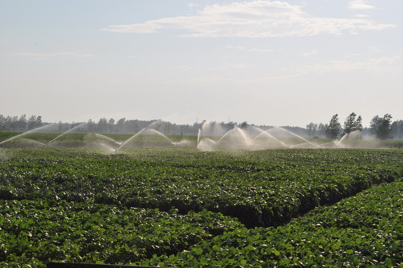 8月6日,位于明光市的安徽农垦潘村湖农场,自动灌溉设备正在浇水。连日高温晴热,当地旱情显现,该农场组织灌溉机械抗旱浇水,力保3万余亩在地作物墒情充足。(安徽日报2013年8月7日01版,本报通讯员杨登宏摄)