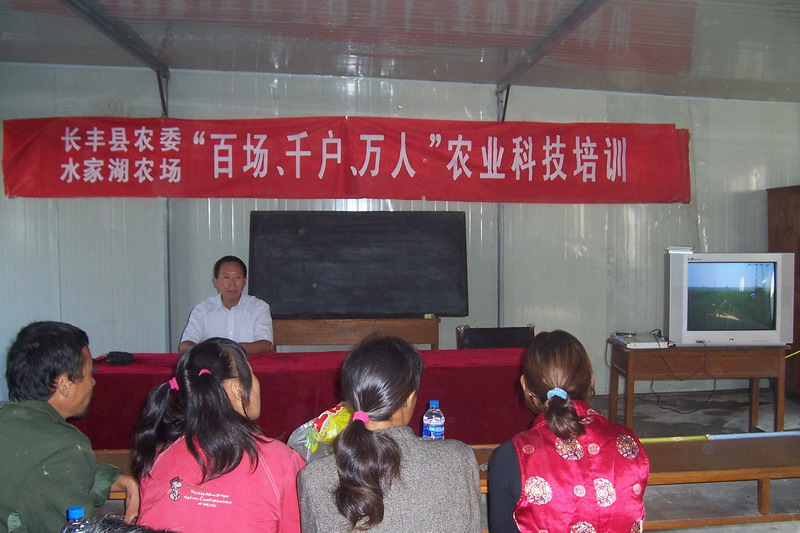 2009年8月31日上午,在长丰县农委的支持与配合下,水家湖农场安排了专业的技术人员,在长丰县明洁专业合作社的培训地点,举办了一次农业科技培训班。此次培训主要将农场的小麦高产栽培技术、农业机械化作业规程等介绍给农民。参加培训的人员达80余人,通过听课,农民不仅增进了对农场的了解,也对农场推广的的良种良法产生了浓厚兴趣。授课结束后一再咨询农场的良种、农药销售点,培训效果较好。