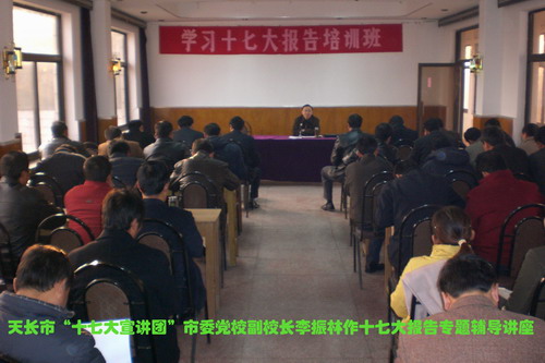 培训班专门邀请了天长市“十七大”宣讲团成员、市委党校副校长李振林到场作十七大报告专题辅导。李副校长运用翔实的资料和生动的语言,解读了十七大报告的“五大理论贡献”,重点阐述了加快推进以改善民生为重点的社会建设的七个方面的“亮点”。李副校长的辅导讲座,点面结合,重点突出,使参训人员对党的十七大报告中的重要思想观点、重大理论创新和重大战略部署有了进一步理解和认识。