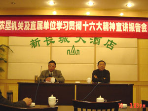 宣讲报告紧紧围绕十六大主题,密切联系十三年来我们 党波澜壮阔的奋斗历程,联系改革开放和现代化建设的 实际,从十六大的重大意义和主题、十三年基本经验和 全面贯彻“三个代表”重要思想、全面建设小康社会的 奋斗目标和重大部署、加强和改进党的建设等方面,对 十六大报告的主要内容和精神实质,以及十六大报告提 出的一系列新思想、新观点、新论断,进行了多方位的 阐述。宣讲报告内容丰富,资料翔实、新颖,信息量很 大。报告还就深入贯彻落实十六大精神,努力开创我省 和我省农垦全面建设小康社会的新局面,谈了自己的体 会。他认为,我们安徽农垦这次提前两个多月召开“全 省农垦工作会议”,并组织与会同志奔赴江苏、浙江农 垦参观学习,是贯彻落实十六大精神的重要举措。会议 总结了2002年的工作及近年来农垦改革和发展的经验, 对2003年及下一步工作做了全面的部署,已经吹响了安 徽农垦全面建设小康社会的进军号角。当前,我们就是 要把干部和群众的思想和认识统一到十六大精神上来, 把干部和群众的力量和智慧凝聚到全面建设小康社会这 一奋斗目标上来,坚持“发展要有新思路、改革要有新 突破、开发要有新格局、各项工作要有新举措”,从而 实现安徽农垦发展的新跨越。