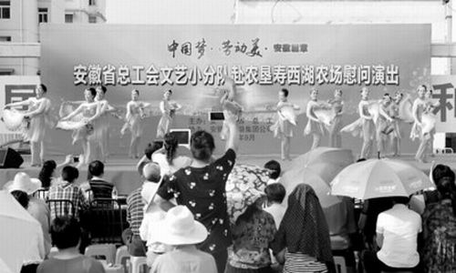 9月12日 ,位于淮南寿县的安徽农垦寿西湖农场迎来了“中国梦·劳动梦”文艺小分队下基层慰问演出。当日,由省总工会组织的演出队伍为千名农场工人带来了精彩的歌舞、相声等表演,现场一片欢声笑语。(安徽日报2016年9月14日 06版,记者温沁摄)