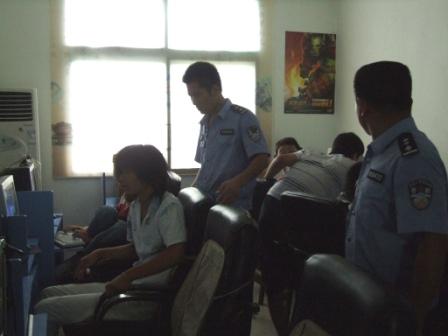 针对暑期学生放假的特殊时段,怀远县雁湖派出所及时派出警力,对辖区内龙亢农场镇区网吧加强管理:一方面以逐个巡查与个别抽查相结合的方式对农场镇区网吧的登记情况和上网人员进行检查,防止未成年人进入网吧,监督各网吧的经营行为;另一方面对进入网吧中的可疑人员进行仔细排查,进一步净化辖区内的治安环境。此举受到了辖区居民的一致好评。(图为雁湖派出所的民警在网吧对上网人员进行仔细检查。)