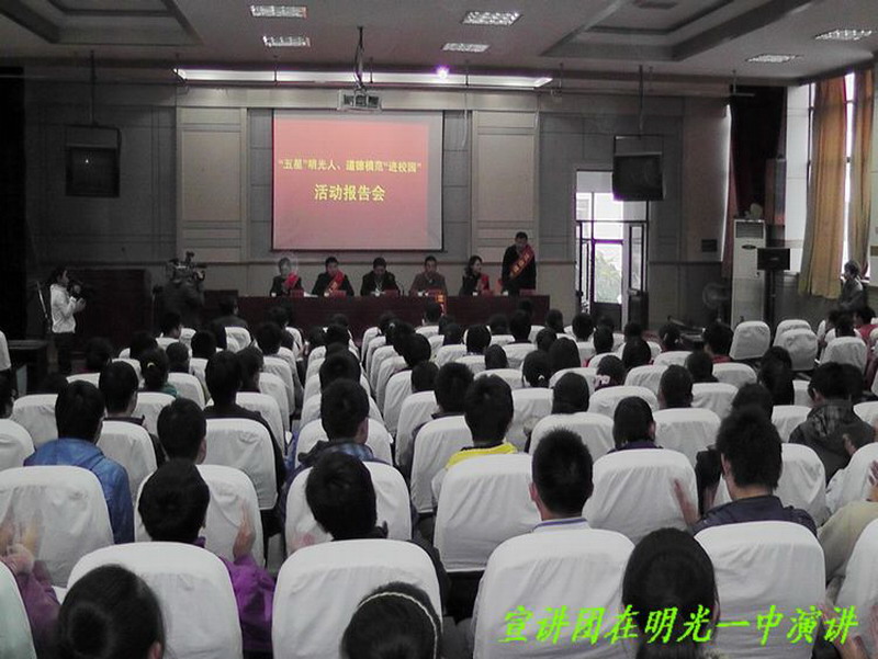 11月18日至21日,安徽省明光市文明委举办第一届“五星”明光人和首届道德模范“进校园”活动,在全市中学举行宣讲报告会。安徽农垦白米山农场杭士江烈士舍己救人的英勇事迹作为重点之一参加报告会,展现在全市中学广大师生面前。