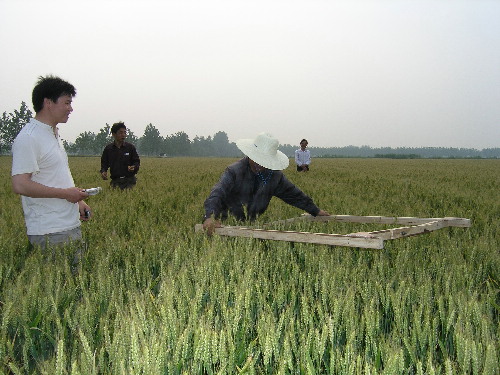 5月21日,在潘村湖农场一块麦田里,由安徽省农垦集团公司派出的一支专门工作小组正在这里按照小麦田间测产规范核定产量水平。