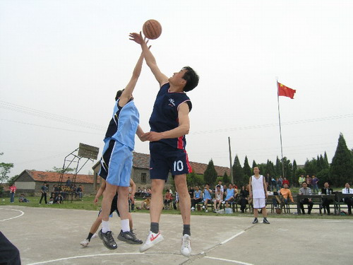 为加强场际交流,增进两场间的了解和友谊,“五一”国际劳动节到来前夕,白米山农场与潘村湖农场于4月28日下午在白米山农场举行了一场精彩纷呈的篮球友谊赛。白米山农场党委副书记、工会主席张华平,潘村湖农场副场长陶卫东为比赛开球。数百名职工群众观看了精彩纷呈的比赛。图为比赛场景。