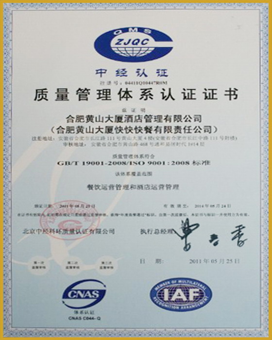 近日,安徽农垦黄山大厦KK快餐有限公司顺利通过了由北京中经科环质量认证有限公司组织的ISO9001:2008质量管理体系认证评审,并获得了认证证书。