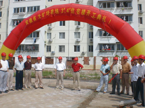 8月18日上午,艳阳高照。大圹圩农场场部 二期职工住宅楼工地上彩旗招展,巨大的彩虹桥会标格外醒目,场部二期职工住宅楼工程开工典礼仪式正在这里举行。场领导及施工单位、工程监理单位、机关场直单位和部分居民参加了开工典礼。
