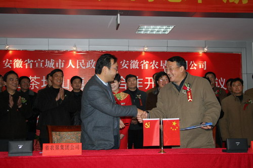 为实施农垦集团化、产业化、投资主体多元化发展战略,安徽省农垦集团公司与宣城市人民政府经过多轮洽谈,达成一致协议,共同开发农垦敬亭山茶场山南土地,建设宣城市水阳江大道。12月17日,省农垦集团公司总经理李卓民与宣城市委常委、常务副市长章钢分别代表省农垦集团公司和宣城市人民政府在合作协议上正式签字,并为敬亭山茶场山南地区开发建设领导小组揭牌。出席签字仪式的有,省农垦集团公司副总经理程军、宣城市人民政府副市长夏月星、市政府副主席吴瑞荣及宣城市有关部门的领导、敬亭山茶场及农垦有关部门负责人。