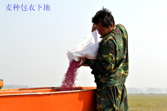 在潘村湖农场,职工家庭农场领到手的麦种都是红颜色的,这是因为这些种子都经过了包衣处理,包衣剂中包含防病防虫的药物成分,也添加了利于种子发芽的微量元素肥料,成为小麦成长阶段的第一道防线。