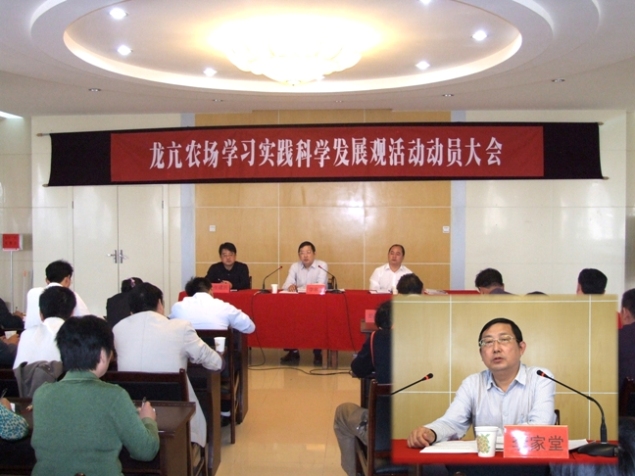 在全党上下开展的学习实践科学发展观活动中,龙亢农场作为安徽省第一批深入学习实践科学发展观活动的单位,专门召开党委专题会议,研究部署开展学习实践科学发展观活动,出台了《安徽省龙亢农场开展深入学习实践科学发展观活动实施方案》(以下简称《方案》),《方案》明确了范围和对象、方法和步骤、相关保障措施。为使学习实践活动抓出成效,龙亢农场党委根据怀远县委的总体部署,结合自身党建工作实际情况,切实加强学习活动的组织领导,及时成立了学习实践活动领导小组,农垦集团公司副总经理、皖垦食品集团公司董事长、总经理、龙亢农场党委书记李家堂任组长,同时还成立了学习实践活动督导组、建立了领导干部联系点,场党委将通过加强工作考核和舆论引导把学习实践活动推向深入。