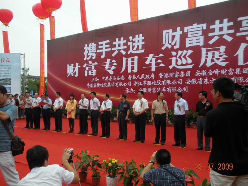 7月28日上午,六安市皋城广场彩球飞扬,锣鼓喧天,诞生在寿西湖农场与寿县共建的工业园区内的安徽财富汽车公司专用车巡展仪式在此隆重举行。省政协副主席王鹤龄,省农垦集团有限公司副总经理刘超,六安市委书记、市人大常委会主任汤林祥,市委副书记、市长张韶春,市政协主席刘庆德,寿县县委书记、县人大常委会主任孟祥新,县委副书记、县长张绪鹏,县政协主席戴克奎,寿西湖农场场长刘国强,市、县直相关单位负责人出席巡展仪式。出席巡展仪式的特邀来宾有香港财富集团主席代表、世界华人协会秘书长宋丽娜,香港财富集团执行副主席、金峰财富集团董事长张家玉等。省政协副主席王鹤龄、县委书记、县人大常委会主任孟祥新、香港财富集团主席代表、世界华人协会秘书长宋丽娜、金峰财富集团副董事长、财富汽车有限公司负责人张艳分别在仪式上致辞。市委副书记、市长张韶春宣布安徽财富汽车巡展开始。县长张绪鹏主持巡展仪式。