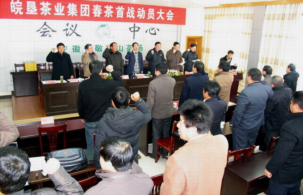 2010年3月10日上午10时50分,春寒料峭,雪后初晴,茶山银妆素裹,敬亭山茶场场部办公楼洋溢着激情和振奋,皖垦茶业集团公司在敬亭山茶场召开2010春茶首战动员大会。茶业集团董事会、监事会成员;茶业集团各场场长、分管生产副场长、生产科长、茶叶分场场长;绿魁公司、绿雪公司、翠剑公司经理、副经理及营销大户代表;集团机关部室负责人参加会议。 会议由省农垦集团副总经理、皖垦茶业集团董事长刘超主持,会议主要议程:1、茶业集团副总经理邱升水宣布2010春茶首战指挥部组成人员名单;2、茶业集团总经理孙国安作春茶生产总动员报告;3、茶区总场场长张国祥代表茶场作号召性发言、生产加工企业代表和基地分场代表分别作了表态性发言;4、省农垦集团公司农水处处长、茶业集团董事李运涛作技术指导讲话;5、茶业集团副总孙国安总经理代表茶业集团和指挥部做春茶生产总动员报告,提出了今年春茶首战工作的目标、任务和措施,他要求要以市场为导向,以质量为中心,以效益为前提,以历史名茶“敬亭绿雪”品牌为支撑,坚持好茶、好包装、好价格的“三好”原则,坚持统一品牌、统一生产工艺及质量标准、统一包装、统一销售政策的“四统一”政策,以敬亭绿雪公司为名优茶加工龙头,带动皖垦茶区名优茶生产,促进企业增效、职工增收。刘超董事长总结强调:召开这次春茶首战动员大会,主要希望与会同志认识再提高、思想再统一、精神再振奋、氛围再浓厚、任务再明确、措施再落实、纪律再严明。从现在开始,皖垦茶业集团上下要凝心聚力,调动一切积极因素,从人、财、物和产、加、销等各方面全力支持确保完成今年春茶首战任务。
