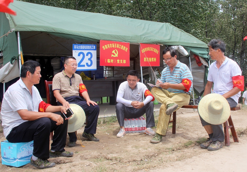 汛情到哪里,党的组织就建到哪里。7月中旬,在华阳河农场5公里的长江同马大堤上,共同在此值守的华阳河农场87名党员与宿松县程岭乡12名党员共同组建了五个跨区临时联合党支部。农业分场党委和村党支部负责人分别担任临时支部书记、副书记,防汛期间,全体党员在帐篷里过起组织生活,在巡堤查险中并肩战斗。