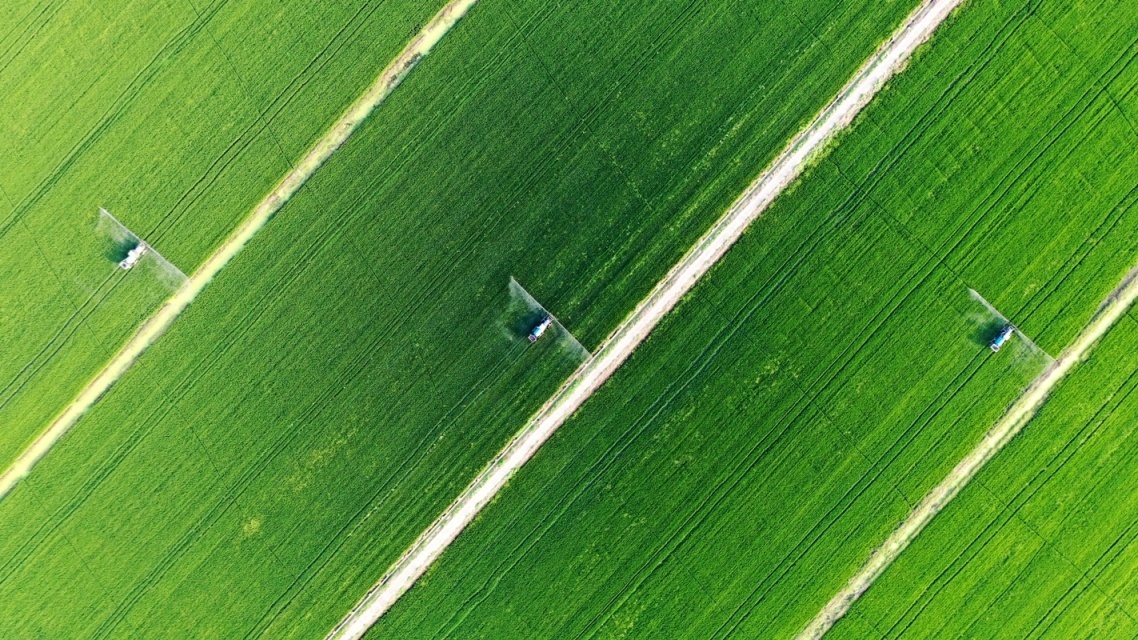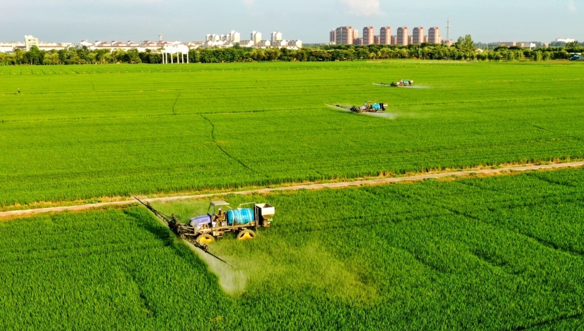 安徽农垦龙亢农场正利用高地隙植保机实施水稻综合防治喷施作业。
