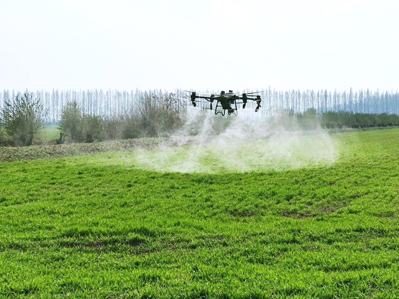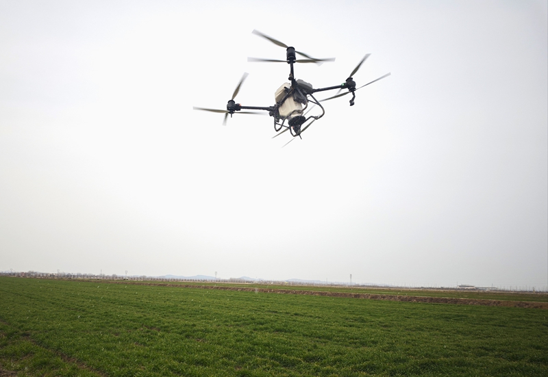 寿西湖农场公司正在使用无人机进行春季麦田化除。刘晨 摄
