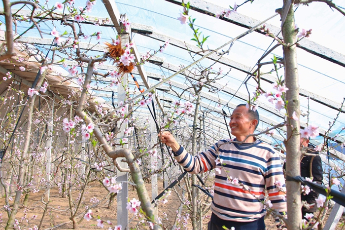 早春时节,砀山果园场公司近1000亩大棚桃花盛开,正是大棚桃花授粉的关键时期,职工正抢抓农时,为桃花授粉。农技人员深入大棚果园现场了解棚内温度、湿度,讲解人工授粉技巧,并引导果农采用生物防虫、防病技术,提高油桃坐果率和果实品质,提升果树的经济效益。(郭茜 供稿)