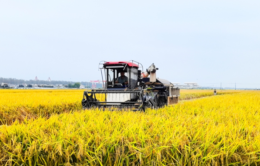 皖河农场水稻标准化机械收割。(徐丽燕 摄)