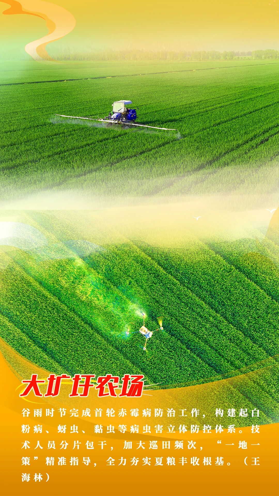连日来,农垦集团各农场抢抓农时,因地制宜、分类施策,全面开展小麦“一喷三防”统防统治工作。从差异化精准施药到自建飞防队伍,从“见花打药”到“一地一策”,各农场以科技赋能、精细管理,全力护航夏粮丰产丰收。截至4月20日,垦区内小麦第一遍防治全面完成。