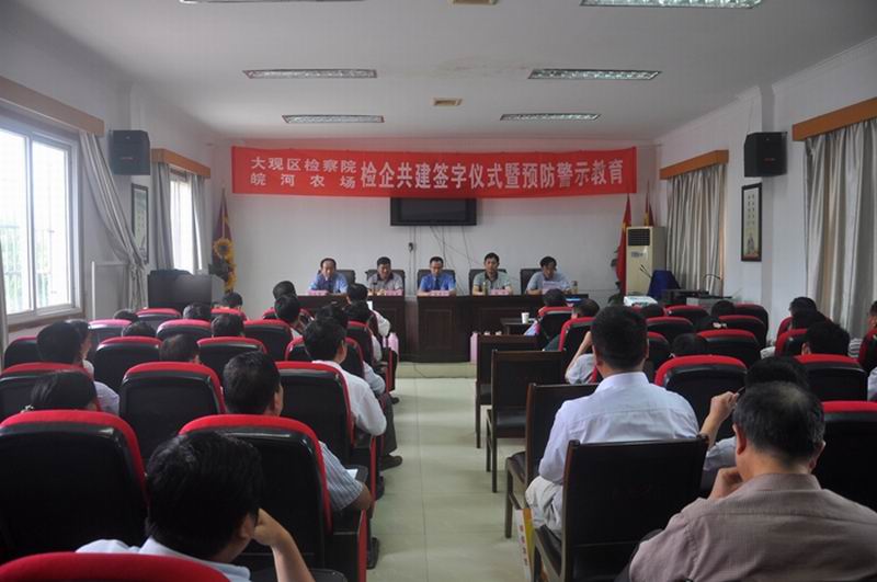 6月18日,皖河农场党委与安庆市大观区检察院联合举行检企共建预防职务犯罪平台签约仪式暨预防警示教育活动。区检察院院长吴才广、副院长何天锡和场领导赵军、胡兴兵、汪丙来、徐和兴、徐英晴、占美能出席,农场各部门单位党政负责人、会计人员参会。