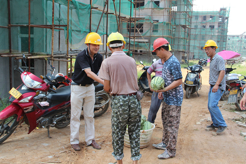 何宗仁代表场党委对建筑工人坚守保障房建设一线表示感谢,并督促施工单位本着“以人为本”的宗旨,合理安排工作和休息时间,落实安全生产措施,做好高温施工服务和工人饮食卫生等后勤保障,确保工人兄弟身体健康,在炎夏中得到一份清凉。