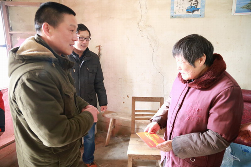 羊年春节将至,2月4日上午,广德县民政局党委委员刘可新率民政所管理办、救灾股负责人到祠山岗茶场慰问送温暖,走访基层下队串户、访贫问苦,把一份份慰问金送到特困职工手中,祝愿他们过上一个欢乐祥和的新春佳节。特困职工对党和政府的关怀表达了最真诚的感谢。