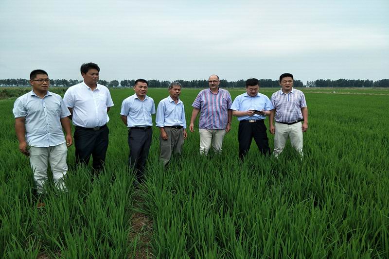 托马斯博士一行查看了阜濛农场“绿旱一号”在地生长情况,听取了场领导程刚就旱稻栽培模式、整地方式、播期播量、植保除草、水肥运筹等关键技术措施落实的情况介绍。德国专家对旱稻种植、种子繁殖等工作进行了现场指导。