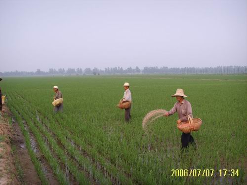 七月上旬,由于集中连降暴雨,使农场部分稻田涝灾严重,导致一些田间管理技术措施没能及时得到落实,加大了当前水稻田管的难度。为了加强技术指导,切实搞好当前田管,结合实际,农场及时拿出了《水稻田近期管理意见》,并邀请农业专家“座客农场”举办了一场有关水稻田管方面的农技知识讲座,有效促进了当前水稻田管各项技术措施的落实。图为:七分场正不失时机组织人员追施水稻分蘖肥。(夏庆芳)