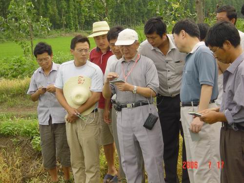 根据叶色深浅程度来确定水稻氮肥施用量是一种经济合理的施肥方法,但叶色“深”与“浅”程度难以用语言文字表述清楚,针对这一问题,朱教授给我场农技人员每人带来一张目前国际通用的水稻施肥“比色卡”,并深入田间地头,实地演示,手把手地教会每个农技员如何使用。