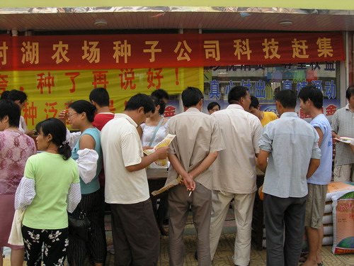 作为农业“国家队”,潘村湖农场始终视宣传、推广和应用农业新品种、新技术为己任,不断增强国营农场在社会主义新农村建设中的科技示范和带动作用,取得了明显的社会效益。近日,该场在周边乡镇开展了一系列科技赶集活动,抓住乡镇逢集日,粮农多来赶集,人员较为集中的机会,组织场农技人员在街头摆上咨询台,向当地粮农宣传良种良法,现场解答群众提出的有关科学种田方面的问题,受到当地广大粮农欢迎。据统计,本次活动共发放农技资料近2000份,接受粮农咨询800多人次。图为8月26日在明光市潘村镇开展科技赶集活动时,前来咨询和领取农技资料的群众络绎不绝的情景。(杨登宏)