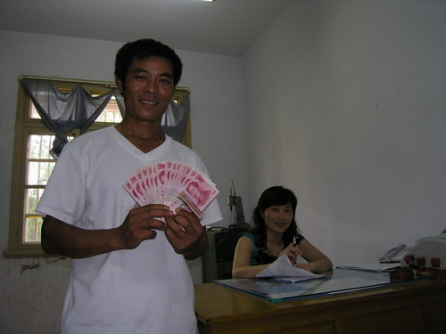 8月4日上午,潘村湖农场一分场职工谷忠明(左)从场财务科领到了2050元奖金。针对近年来夏大豆市场价格持续走低,耕地亩均收益较低,职工增收缓慢的情况,潘村湖农场不断加大农业结构调整力度,在巩固小麦种子粮生产的同时,以市场为导向,积极发展优质、高产、高效的调秋作物,促进职工增收,并将2006年确定为“结构调整年”,出台了一系列扶持和激励措施,在技术、资金和产品销售等方面给予支持。今年夏种期间,在场农技部门的指导下,谷忠明等几户家庭农场引进旱稻新品种在大田进行连片种植,预计亩均效益较种植大豆提高近一倍,为全场秋季作物结构调整起到了示范带动作用。根据场有关鼓励结构调整规定,农场按每亩50元的标准对结构调整示范户给予了奖励。 |