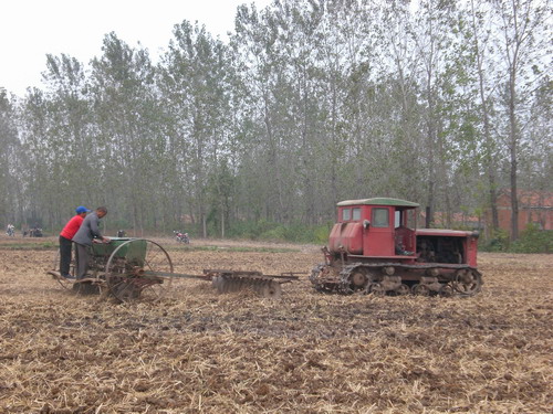 10月27日,大圹圩农场秋收秋种进度较快的农业第三管理区呈现出一派紧张繁忙的景象,只见一块已割晒好的稻田里集中了四五部收割机在捡拾脱粒水稻,而在相邻的一块经过深耕细耙的稻茬田里,“东方红”正在适墒抢播小麦。据了解,到当晚,这个管理区水稻割晒已基本完成,有近2000亩水稻脱粒登场,400多小麦播种下田。
