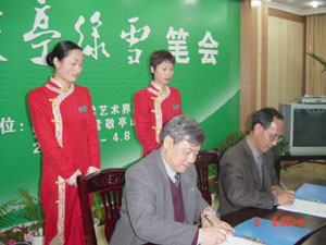 笔会的座谈会上,文艺家们在品尝名茗——敬亭绿 雪的同时,观看了安徽农业大学茶艺表演队“中华 茶艺——敬亭绿雪茶艺”表演,听取了茶叶专家有 关敬亭绿雪历史、传统工艺的恢复、敬亭绿雪的品 质和市场定位的介绍,接着文艺家与茶叶专家,就 中华茶文化的历史渊源,敬亭绿雪的品牌战略、市 场运作、产品的质量保障、产品的市场定位、产品 的规格和包装、开拓国际市场等方面进行了深入的 探讨,文艺家们提出了许多很好的建议。文艺家认 为这次文化与经济联手,名人与名茶结合,举办笔 会,是一项大胆的创新和成功的策划,是有远见的 企业家的正确决策,将对树立安徽农垦的企业形 象,打造“敬亭绿雪”品牌具有长期的重要意义。 在会场文艺家们,感受到安徽绿茶的品质,尤其是 茶中珍品——敬亭绿雪“色纯如玉、品静似天”香 醇,使他们灵感大发,当场呤诗作赋,挥毫泼墨, 给安徽农垦留下了宝贵的精神财富,陶冶了农场职 工的情操,提升了“敬亭绿雪”的文化底蕴,丰富 了农垦企业文化,必将极大地鼓舞安徽农垦人在全 面建设小康社会的伟大征程中意气风发、满怀豪情 地开创农垦事业发展的新局面。