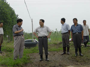 7月6日下午,省农垦事业管理局局长、党委书记丁 俊先、劳动人事处副处长洪浩一行来到大圹圩农 场,了解水情汛情,检查指导防汛排涝工作。