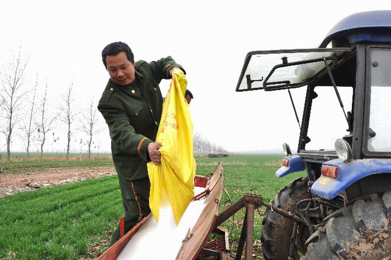 2月28日下午,潘村湖农场二管区职工范刚正在田间追施小麦返青拔节肥。2月下旬以来,该农场广大职工家庭农场在农技人员指导下,抓住当前有利时机,积极开展田管作业。3月1日,全场3.2万亩小麦已普遍追施了一遍返青拔节肥。(杨登红)