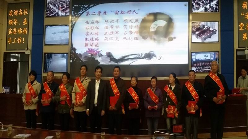 颁奖式上,荣获第二季度见义勇为“宿松好人”的农场退伍老兵任在林(图片右一)上台领奖,他“勇救落水儿童”的英雄事迹在宿松县广为流传。(程来保)