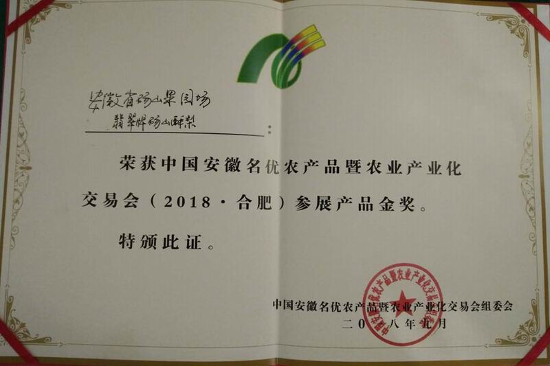 9月15-17日,2018中国安徽名优农产品暨农业产业化交易会在合肥举行。安徽农垦砀山果园场翡翠牌酥梨夺得农交会参展产品金奖。