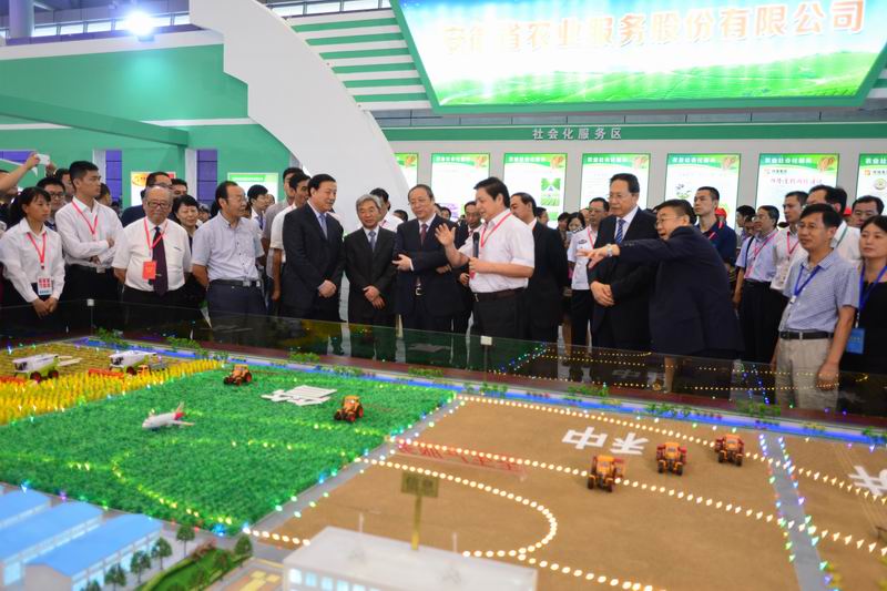 上午10时,安徽省委书记王学军、省长李锦斌、副省长梁卫国、农业部副部长张桃林莅临农垦农服公司展厅视察,观看了全过程、全要素、全产业链的农业社会化服务沙盘演示,听取了“主体多元化、运行市场化、服务专业化”的功能目标介绍。王学军、张桃林充分肯定了“三全”服务模式,希望安徽农垦加快构建新型农业社会化服务体系,在全省更大范围内推广应用,让更多农民受惠受益。