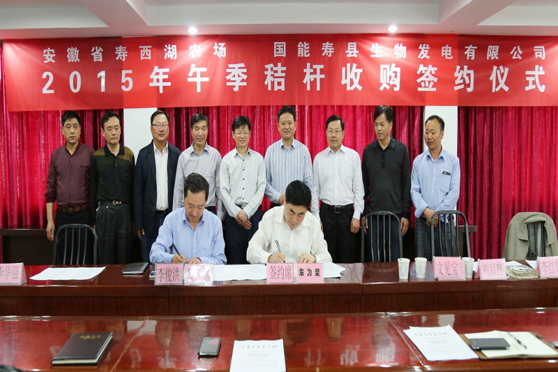 为贯彻落实省政府关于加快发展农作物秸秆发电的意见,4月27日下午,安徽农垦寿西湖农场与国能电力集团旗下寿县生物发电有限公司举行2015年秸秆收购签约式,联手推进5.6万亩农作物秸秆禁烧,添力秸秆能源化利用和资源节约、环境保护。