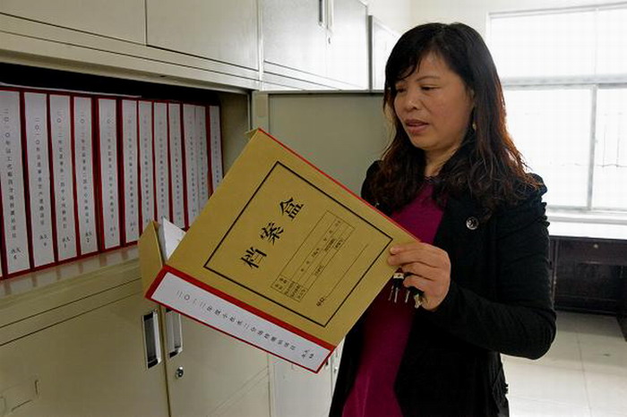 记者在王振荣简单的办公室里看到,靠墙边摆放着一台老式缝纫机,上面一台崭新的档案扎针机。办公室主任王伟指着缝纫机说,以前把档案归档前都要把档案扎好,王振荣就把自家的缝纫机抬来扎档案。“现在购买的档案扎针机,她还不舍得用。”