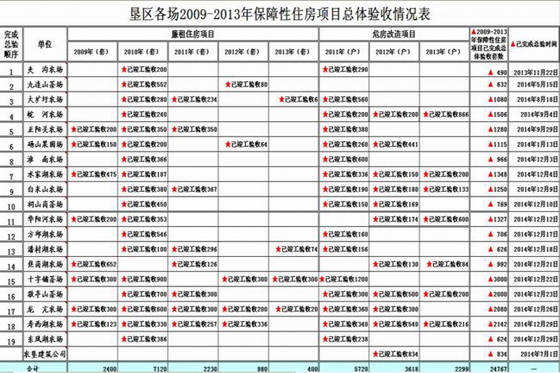 会上通报了安徽农垦保障性安居工程项目“冲刺收官”竣工总验情况:截至2014年12月29日下午,按照“符合政策、职工满意、经得起检查”的要求和严谨规范的程序,在职工代表的参与见证下,垦区19个场及垦建公司的保障性住房项目24767套(户)竣工总验全面完成,规划打造崭新的职工群众居住环境、花园小区全部建成,向广大职工群众交出了一份满意的答卷,基本实现了垦区“楼房化、花园式、全覆盖”的新型城镇化蓝图。会议充分肯定了集团领导小组成员单位在垦区保障房建设6年奋战中的通力合作、艰辛努力和优质服务,要求各成员单位根据各自分工,继续督导各场完成保障房竣工总验后的整改扫尾工作,同时部署了总结工作和后续任务。(朱钰霖)