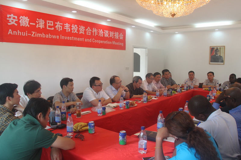 考察团一行在皖津公司举行“安徽——津巴布韦投资合作洽谈对接会”。依柯阮姆巴少将代表津国防部欢迎安徽客人到访,并介绍了津巴布韦经济社会发展的主要情况,面临的困难与机遇,有望合作开发的重点领域,以及安徽农垦皖津项目存在的优势与经验。卢宏世在发言中说,中津友好渊源、各自现实国情决定了双方合作的必要性和可行性,去年中国对非投资中,安徽省占了10%,足见对非洲及津巴布韦投资的重视。他希望津国防部给予更多关注与支持,并表示安徽省商务厅将一如既往地引导和帮助更多皖企赴津发展。对接会后,考察团实地察看了皖津公司合作开发项目和所属农场玉米、大豆、烟草生产及育种基地,充分肯定皖津公司在当地降雨推迟一个月的气象条件下,通过昼夜不停灌溉完成了雨季作物播种且长势喜人的良好成果。