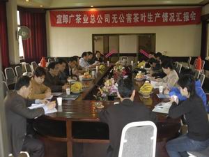 4月18日,宣郞广茶业总公司邀请省农委、安徽农业 大学的茶叶专家教授和农业中央驻皖和省内主要媒 体进行座谈,汇报本公司茶叶夫公害生产情况,并 向公众承诺,到明年,全公司2万亩茶园将全部实行 统防统治。